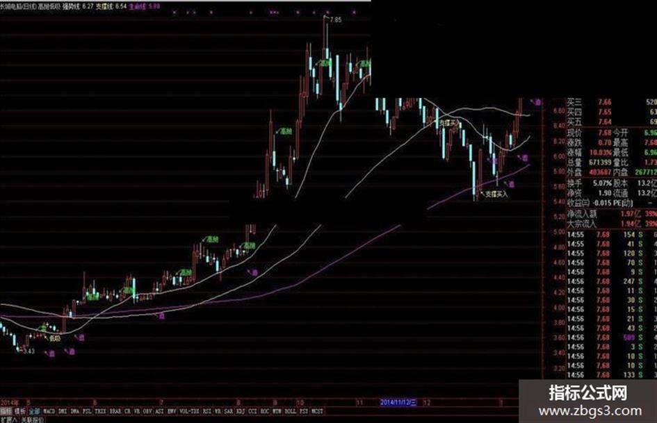 支撑买入:=IF(C<强势线 AND C>生命线,MH,0);