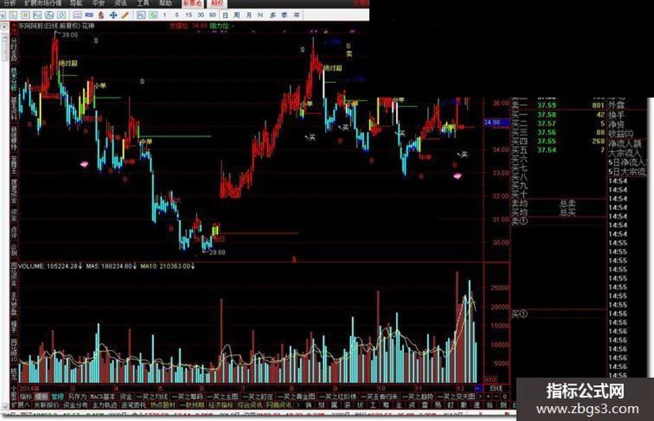 DRAWTEXT(卖出条件 AND D2>=36 AND D2<39,HIGH*1.13,'↙赚38%'),COLORRED;