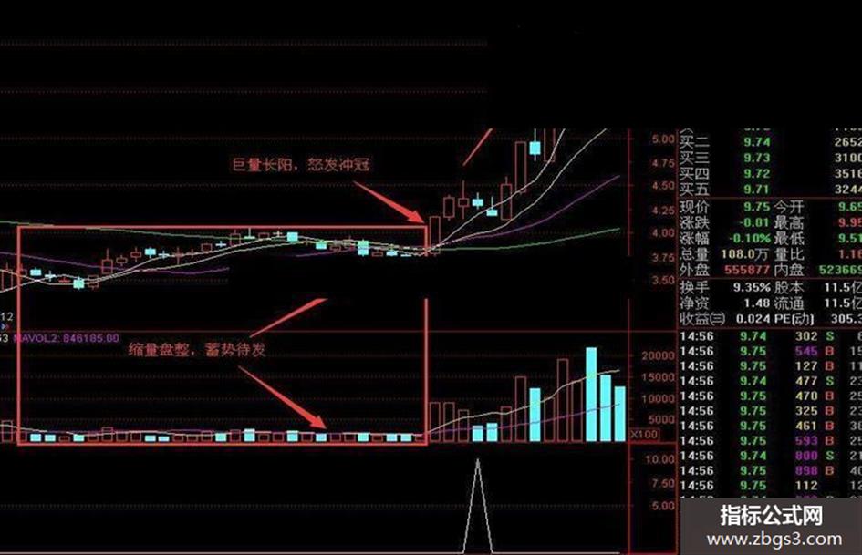 A1:=V>REF(MA(V,20),1)*3 AND V>REF(MA(V,3),1)*2; A2:=C>REF(HHV(C,20),1) AND REF(HHV(H,12)/LLV(L,20),1)<1.15; A3:=A1 AND A2 AND C>O*1.033; A4:=REF(A3,3) AND HHV(H,3)/LLV(L,3)<REF(H/L,3) AND LLV(L,3)>REF(O,3) AND LLV(C,3)>REF((C+O)/2,3); SS:10*A4;