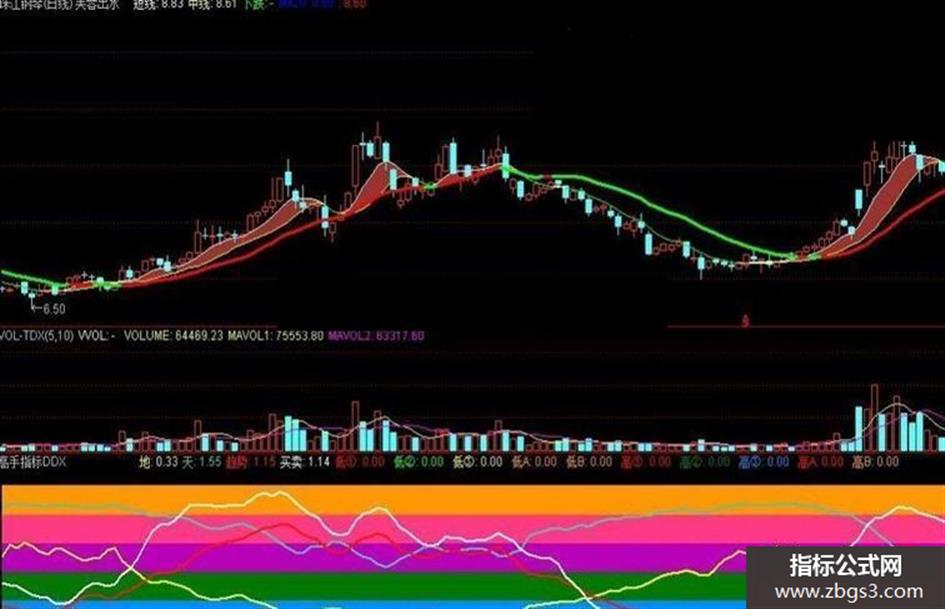 DRAWBAND(0,RGB(0,139,255),0.5,RGB(0,139,255)),COLORFF8B00; DRAWBAND(0.5,RGB(0,120,0),1,RGB(0,120,0)),COLOR007800; DRAWBAND(1,RGB(187,0,187),1.5,RGB(187,0,187)),COLORBB00BB; DRAWBAND(1.5,RGB(255,58,133),2,RGB(255,58,133)),COLOR853AFF; DRAWBAND(2,RGB(255,152,0),2.5,RGB(255,152,0)),COLOR0098FF; DRAWTEXT(ISLASTBAR,0.25,'███'),COLORFF8B00; DRAWTEXT(ISLASTBAR,0.25,'冰冻'),COLORFFFFCC; DRAWTEXT(ISLASTBAR,0.75,'███'),COLOR007800; DRAWTEXT(ISLASTBAR,0.75,'冷门'),COLORWHITE; DRAWTEXT(ISLASTBAR,1.25,'███'),COLORBB00BB; DRAWTEXT(ISLASTBAR,1.25,'活跃'),COLORFFFFCC; DRAWTEXT(ISLASTBAR,1.75,'███'),COLOR853AFF; DRAWTEXT(ISLASTBAR,1.75,'热门'),COLORWHITE; DRAWTEXT(ISLASTBAR,2.25,'███'),COLOR0098FF; DRAWTEXT(ISLASTBAR,2.25,'高温'),COLORWHITE; {计算数据} R:=PERIOD; S:=FROMOPEN;VA1:=EMA(CAPITAL/IF(R=0,SUM(VOL,S),VOL)/CLOSE,10)/CLOSE; 地:IF(VA1>=2.5,2.5,VA1),COLORYELLOW,LINETHICK2; 天: POW(ATAN(EMA(CAPITAL/IF(R=0,SUM(VOL,S),VOL)/CLOSE,10)),2),COLORB5CA43,LINETHICK2; 趋势: EMA(WINNER(CLOSE)*100,10)/50,LINETHICK2,COLOR0015FF; 买卖: EMA((-3)*(HHV(HIGH,30)-CLOSE)/(HHV(HIGH,30)-LLV(LOW,30))+2.7,9),COLORWHITE,LINETHICK2; {低位信号} 低①:买卖<0,COLORRED,NODRAW; STICKLINE(低①,0,-0.1,3,0), COLORRED; 低②:买卖<0.1 AND 买卖>0 AND 买卖>=ref(买卖,1),COLORGREEN,NODRAW; STICKLINE(低②,0,-0.1,2.5,0), COLORGREEN; 低③:买卖<0.25 AND 买卖>0.1 AND 买卖>=ref(买卖,1),COLORYELLOW,NODRAW; STICKLINE(低③,0,-0.1,2,0), COLORYELLOW; 低A:买卖<0 AND 买卖>=ref(买卖,1),COLOR0099FF,NODRAW; STICKLINE(低A,0.1,-0.1,3,0), COLOR0099FF; 低B:买卖<ref(HHV(买卖,5),4) AND 买卖>=ref(买卖,1) AND 买卖<0.8 AND 趋势>=ref(趋势,1) AND ref(EXIST(买卖<=ref(买卖,1),2),1) AND ref(EXIST(买卖<=0,10),8),COLOR0099FF,NODRAW; STICKLINE(低B,0.3,0,3,0), COLOR0099FF; {高位信号} 高①:买卖>2.5 AND 买卖>ref(买卖,1),COLORRED,NODRAW; STICKLINE(高①,2.6,2.4,3,0),COLORRED; 高②:天>=1.9 AND 买卖>=2.2 AND CROSS(ref(HHV(买卖,3),3),天),COLOR007800,NODRAW; STICKLINE(高②,2.6,2.4,2.5,0),COLOR007800; 高③:天<1.77 AND 买卖>=2.2 AND CROSS(ref(HHV(买卖,7),6),天),COLORFF8B00,NODRAW; STICKLINE(高③,2.6,2.4,2,0),COLORFF8B00; 高A:买卖>2.45 AND 买卖<2.5 AND 买卖<=ref(买卖,1), COLORRED,NODRAW; STICKLINE(高A,2.5,2.4,3,0), COLORRED; 高B:买卖>ref(LLV(买卖,5),4) AND 买卖<=ref(买卖,1) AND 买卖>1.5 AND 趋势<=ref(趋势,1) AND ref(EXIST(买卖>=ref(买卖,1),2),1) AND ref(EXIST(买卖>=2.48,10),8), COLOR0099FF,NODRAW; STICKLINE(高B,2.7,2.4,3,0), COLOR0099FF;