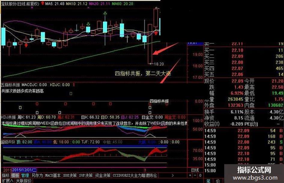 五指标共振,自用选股,副图,无未来,成功率高,通常来说,多个指标同时出现买入信号时成功率比较高,本指标是5个指标融合在一起的,如果3个,4个,5个指标同时发出买入信号时,就会提示预警,指标副图里会有文字,例如三指标共振,四指标共振,五指标共振。出此信号时可以进场操作,在牛市时很容易抓住主升浪,在熊市里很容易找到强于大盘的个股。