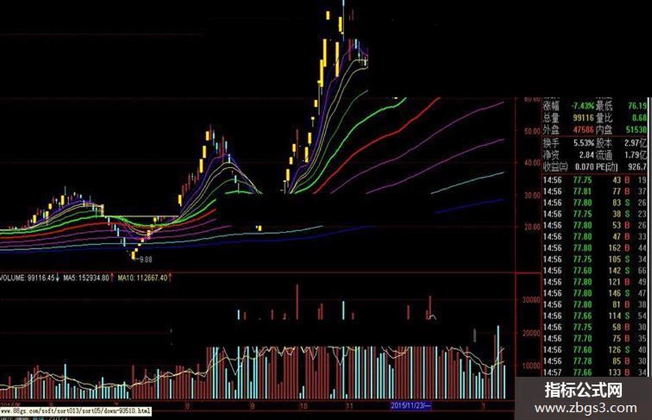 中线: (MA(CLOSE,3) + MA(CLOSE,6) + MA(CLOSE,12) + MA(CLOSE,24))/4,COLORMAGENTA;