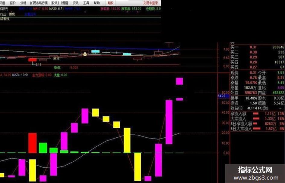 主力进场:IF(VAR5>REF(VAR5,1),VAR5,0),COLORRED,NODRAW;