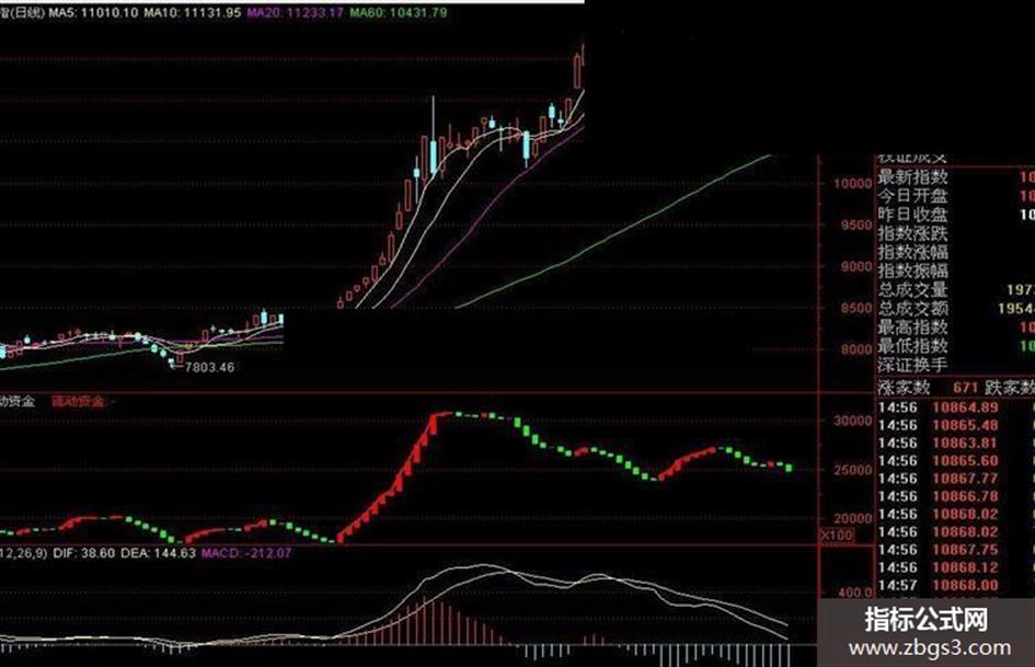 VAR1:=SMA(AMOUNT/10,10,1)/10000; VAR2:=REF(VAR1,1); 资金运转: STICKLINE(VAR1>VAR2,VAR1,VAR2,2,0),COLORRED; 资金流失: STICKLINE(VAR1< VAR2,VAR1,VAR2,2,0),COLORGREEN; 流动资金: IF(VAR1>VAR2,VAR1,DRAWNULL),COLORRED,LINETHICK2;