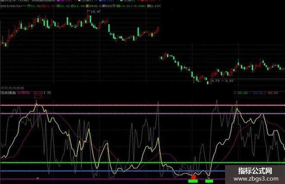 底部区域:(长期线<12 AND 中期线<8 AND (短期线<7.2 OR REF(短期线,1)<5) AND (中期线>REF(中期线,1) OR 短期线>REF(短期线,1)))