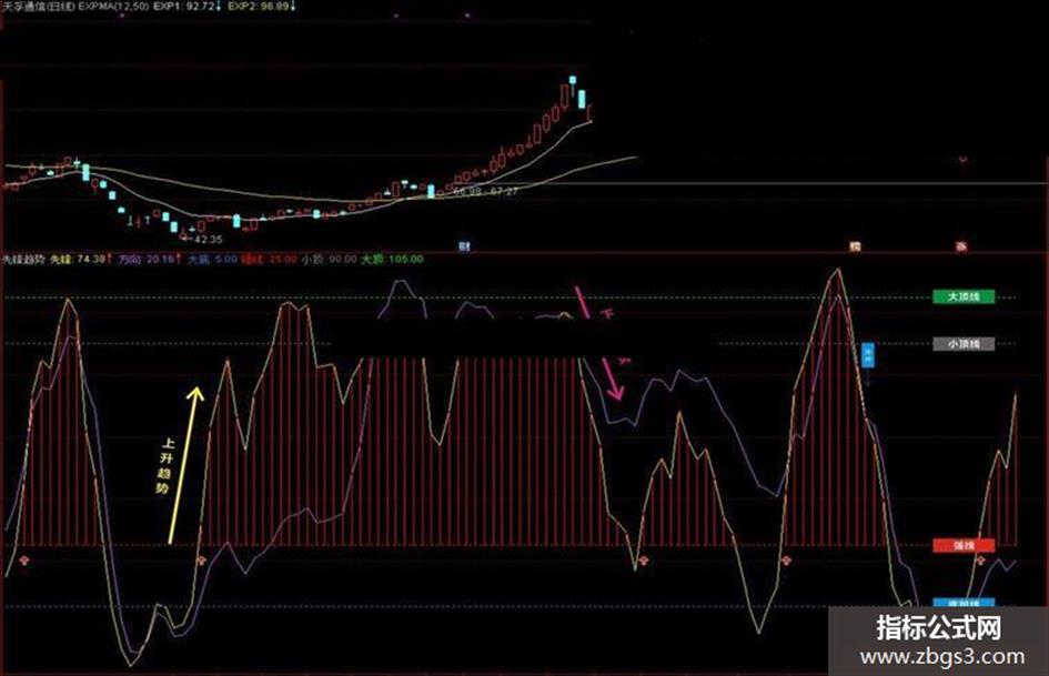 先锋趋势指标,黄色线条表示先锋,紫色线条表示方向,特别感谢飞远国际老师帮忙修改。