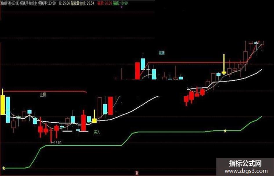 MMS:=MA(SMA((L+H+2*C)/4-REF((L+H+2*C)/4,1),5,1)/SMA(ABS((L+H+2*C)/4-REF ((L+H+2*C)/4,1)),5,1)*100,1)+50; G1:=IF(-MMS>95,0,20); UOO:=(-(((CLOSE-LLV(CLOSE,7))/(HHV(CLOSE,7)-LLV(CLOSE,7))*100=100)>0 AND G1)+1); {明日均线:=REF(C,2)*2-REF(C,5),LINETHICK0,COLOR550055 ; 后日均线:=REF(C,1)*2-REF(C,4),LINETHICK0,COLOR008800; 大后天均线:=C*2-REF(C,3),LINETHICK0,COLOR008888;} KS:=(((CLOSE - EMA(CLOSE,13)) / EMA(CLOSE,13)) * (0 - 100)); KS1:=IF(BARSCOUNT(C)=1,C/10000,(1-C/SMA(C,13,1))*100); 趋势线:=EMA(((KS / 10) + EMA(CLOSE,10)),3); AA:= - 100 * (趋势线 - CLOSE) / 趋势线; AC:=(EMA(AA,5) ); SSL:=EMA(CLOSE,3); MMV:=EMA(((SLOPE(CLOSE,22) * 20) + CLOSE),55); MM:=MMV; {STICKLINE(((SSL > MM) ),SSL,MM,0.1,0),COLORRED;} SA:=(MM * 0.985); SS:=(MA(CLOSE,5)); DD:=(MA(CLOSE,13)); GG:=(MA(CLOSE,21)); 捞钱手:IF(((SSL > MM)),MM,SA),LINETHICK2,COLORWHITE; VAR2Y:=(((CLOSE - REF(CLOSE,1)) / REF(CLOSE,1)) * 100); VAR3Y:=(((CLOSE - REF(OPEN,29)) / REF(OPEN,29)) * 100); VAR4Y:=REF(CLOSE,1); VAR5Y:=((SMA(MAX((CLOSE - VAR4Y),0),6,1) / SMA(ABS((CLOSE - VAR4Y)),6,1)) * 100); VAR6Y:=((SMA(MAX((CLOSE - VAR4Y),0),12,1) / SMA(ABS((CLOSE - VAR4Y)),12,1)) * 100); VAR7Y:=((SMA(MAX((CLOSE - VAR4Y),0),24,1) / SMA(ABS((CLOSE - VAR4Y)),24,1)) * 100); VAR8Y:=(((CLOSE - LLV(LOW,45)) / (HHV(HIGH,45) - LLV(LOW,45))) * 100); VAR9Y:=SMA(VAR8Y,3,1); VARAY:=SMA(VAR9Y,3,1); VARBY:=((3 * VAR9Y) - (2 * VARAY)); VARCY:=(CROSS(VAR5Y,10) AND (VAR3Y < (0 - (28 * 20)))); VARDY:=((100 - CROSS(76,VAR5Y)) AND (VAR3Y > (5 * 20))); DRAWICON(((CROSS(76,VAR5Y) AND (VAR3Y > 5)) ),(HIGH * 1.01),5),COLORFFFFFF; VAREY:=((((CROSS(VAR9Y,VARAY) AND (VARAY < 10)) AND (VAR3Y < (0 - 30))) AND (VAR2Y > 3)) * 30); VARFY:= - ((((VARAY < 11) AND (VAR5Y < 15)) AND (VAR3Y < (0 - 26))) * 10); DRAWICON((CROSS(VARFY,(0 - 9))),(LOW * 0.998),4); 能量线:=DMA(((CLOSE + OPEN) / 2),(VOL / (SMA(VOL,4,1) * 4))); 上开:=O; 上收:=C; 上高:=H; 上低:=L; JJ:=(上开+上高+上低)/3; A:=EMA(JJ,4); B:REF(A,1),POINTDOT,COLORYELLOW; 智能黄金线:A,COLORYELLOW,LINETHICK1; VA1:=EMA(上收,8); VA2:=EMA(上收,20); DRAWTEXT(CROSS(VA2,VA1),VA1*1.10,'止损'),COLORYELLOW; DRAWTEXT(CROSS(VA1,VA2)AND(C>=O)AND 智能黄金线>REF(智能黄金线,1),VA1*0.96,'买入'),COLOR00FF00; 选手A:=MA(上收,3); 箱顶A:=MA(REF(HHV(上收,6),1),3); 箱底A:=MA(REF(LLV(上收,3),1),3); T1:=MA(上收,20)>=REF(MA(上收,20),1); T2:=CROSS(选手A,箱底A) AND 箱顶A/箱底A>100/100 AND T1; T3:=CROSS(箱顶A,选手A) AND 箱顶A/箱底A>100/100; 选手:=MA(上收,2); 箱顶:MA(REF(HHV(上收,30),1),2),COLOR0000FF,LINETHICK2; 箱底:MA(REF(LLV(上收,30),1),2),COLOR00FF00,LINETHICK2; T4:=CROSS(选手,箱底) AND 箱顶/箱底>110/100; T5:=CROSS(箱顶,选手) AND 箱顶/箱底>110/100; VAR1:=(上收-LLV(上低,27))/(HHV(上高,27)-LLV(上低,27))*100; VAR2:=SMA(VAR1,3,1); VAR3:=SMA(VAR2,3,1); VAR4:=SMA(VAR3,3,1); DRAWTEXT(CROSS(VAR3,VAR4)AND(C>=O)AND VAR3<40 AND UOO>0,箱底,'★'),COLORF00FF0; DRAWTEXT(CROSS(VAR4,VAR3) AND VAR4>75 ,箱顶*1.03,'减磅'),COLORF0F000; VAR111:=CLOSE>REF(CLOSE,1) AND CLOSE>REF(CLOSE,2); VARD:=CLOSE<REF(CLOSE,1)AND CLOSE<REF(CLOSE,2); VARE :=REF(VARD,1) AND CLOSE>=REF(CLOSE,1) AND CLOSE<=REF(CLOSE,2); VARF :=REF(VARE,1) AND CLOSE<=REF(CLOSE,1) AND CLOSE>=REF(CLOSE,2); VAR10 :=REF(VARF,1) AND CLOSE>=REF(CLOSE,1) AND CLOSE<=REF(CLOSE,2); VAR11:=REF(VAR10,1) AND CLOSE<=REF(CLOSE,1) AND CLOSE>=REF(CLOSE,2); VAR12:=REF(VAR11,1) AND CLOSE>=REF(CLOSE,1) AND CLOSE<=REF(CLOSE,2); VAR13:=REF(VAR12,1) AND CLOSE<=REF(CLOSE,1) AND CLOSE>=REF(CLOSE,2); VAR14:=REF(VAR13,1) AND CLOSE>=REF(CLOSE,1) AND CLOSE<=REF(CLOSE,2); VAR15:=REF(VAR14,1) AND CLOSE<=REF(CLOSE,1) AND CLOSE>=REF(CLOSE,2); VAR16:=REF(VAR15,1) AND CLOSE>=REF(CLOSE,1) AND CLOSE<=REF(CLOSE,2); VAR17:=REF(VAR16,1) AND CLOSE<=REF(CLOSE,1) AND CLOSE>=REF(CLOSE,2); VAR18:=REF(VAR17,1) AND CLOSE>=REF(CLOSE,1) AND CLOSE<=REF(CLOSE,2); VAR19:=REF(VARD OR VARE OR VARF OR VAR10 OR VAR11 OR VAR12 OR VAR13 OR VAR14 OR VAR15 OR VAR16 OR VAR17 OR VAR18,1) AND VAR1; 趋势线1:=FORCAST(CLOSE,7); FK:=100*(C-REF(C,1))/REF(C,1); PK1:=IF(C<REF(O,1) AND FK<0,1,0); PK2:=IF(C<REF(O,2) AND FK<0,1,0); STICKLINE((PK1=0 AND REF(PK1,1)=1 AND PK2=0 AND REF(PK2,1)=1)AND(趋势线1>REF(趋势线1,1)OR 智能黄金线>REF(智能黄金线,1)),OPEN,CLOSE,3,0),COLORRED; STICKLINE((PK1=0 AND REF(PK1,1)=1 AND PK2=0 AND REF(PK2,1)=1)AND(趋势线1>REF(趋势线1,1)OR 智能黄金线>REF(智能黄金线,1)),H,L,0.5,0),COLORRED; PK3:=(((CLOSE / OPEN) > 1.04) AND (CLOSE <(SMA(HIGH,21,2) * 1.05))) AND ((CLOSE - REF(CLOSE,1)) > 0); STICKLINE(PK3 AND(趋势线1>REF(趋势线1,1)OR 智能黄金线>REF(智能黄金线,1)),CLOSE,OPEN,3,0),COLORRED; STICKLINE(PK3 AND(趋势线1>REF(趋势线1,1)OR 智能黄金线>REF(智能黄金线,1)),H,L,0.5,0),COLORRED; STICKLINE(VAR19 AND(趋势线>REF(趋势线1,1)OR 智能黄金线>REF(智能黄金线,1)),CLOSE,OPEN,3,0),COLORRED; STICKLINE(VAR19 AND(趋势线>REF(趋势线1,1)OR 智能黄金线>REF(智能黄金线,1)),H,L,0.5,0),COLORRED; 买进价:=((C-REF(MA(C,6),1))/6+MA(C,6))*1.004; 买进条件:=CROSS(C,买进价) AND 买进价>REF(买进价,1); STICKLINE(买进条件 AND 捞钱手>智能黄金线 AND 智能黄金线>REF(智能黄金线,1),L,L*0.998,7,0),COLORWHITE; 买线:=EMA(C,2); 卖线:=EMA(SLOPE(C,21)*20+C,42); DRAWTEXT(CROSS(买线,卖线)AND 箱顶>=REF(箱顶,1),箱底,'★'),COLOR00FFFF; STICKLINE(CROSS(买线,卖线),OPEN,CLOSE,3,0),COLOR00FFFF; STICKLINE(CROSS(买线,卖线),H,L,0.5,0),COLOR00FFFF;
