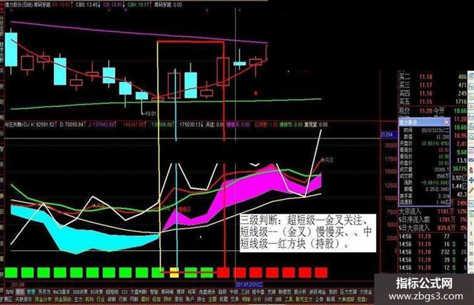 超短线级别的金叉是初步判断,大胆的可以1/4买入,短线级别的金叉(RSV级别的KDJ---经典KDJ)也可以1/4买入,累计1/2;中短线级别(MA(C.9)、MA(C,55))判断——持股区可以可以1/2买入.卖出的判断反之(死叉)。慢慢体会吧。