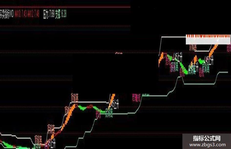 支撑:MA(REF(LLV(C,30),1),2),COLORABFF46; AA1:=AMOUNT/V;BB1:=L<AA1*0.9;