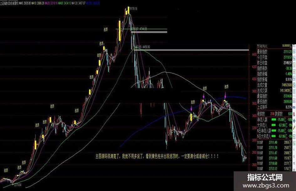 本源码适合 “通达信” 用,其它软件没有测试,把源码加入到任何主图中即可。本逃顶源码不仅适合看上证指数,也可以看个股的逃顶,希望大家下载加入主图后去复盘,在大牛市行情中,可能会频繁出现,配合5日线和10日线,只要5日线不发生往下的拐点就继续持有。