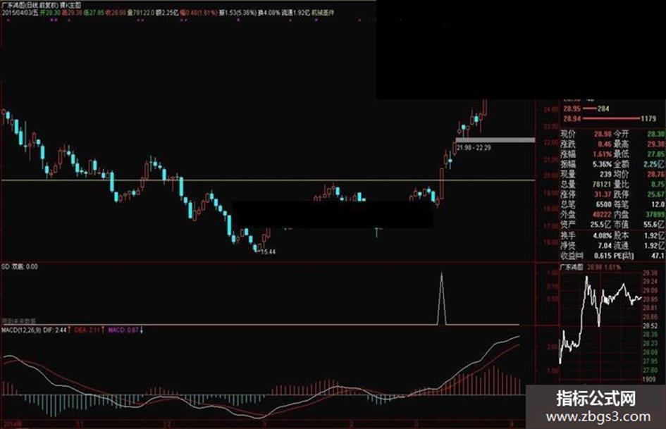 双底:CROSS(C,前高) AND REF(前高,T+2)>前高 AND LLV(L,T)>REF(LLV(L,T1),T+2) AND REF(HHV(H,T-1),1)<前高 AND (HHV(H,100)-C)/HHV(H,100)*100>10;