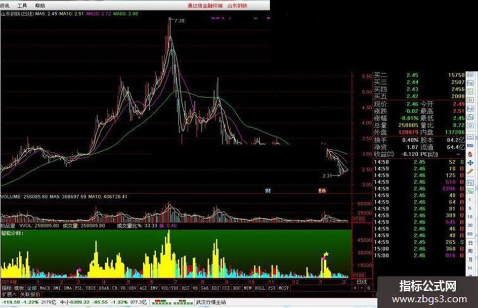 主卖:=IF(CLOSE>OPEN,AA*((HIGH-CLOSE)+(OPEN-LOW)),IF(CLOSE<OPEN,AA* (HIGH-LOW),VOL /2)),COLORCYAN,POINTDOT;