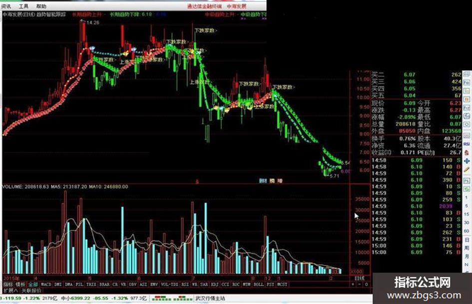 长期趋势下降:IF(TMP<=长期趋势线,长期趋势线,DRAWNULL),LINETHICK4,COLORGREEN;