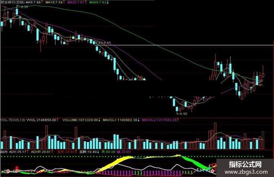 STICKLINE(CROSS(ADX,主跌) AND 主跌<20 AND ADX>ADXR,20,40,1,0),COLOR0000DD;