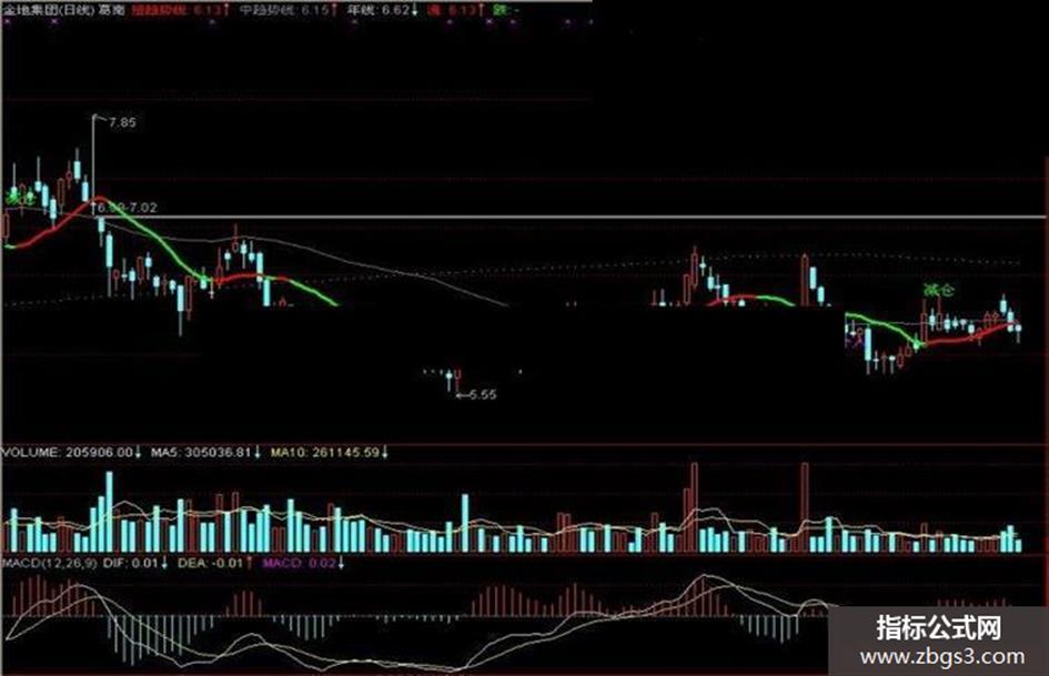 中趋势线:MA(CLOSE,55),LINETHICK1,COLORGRAY;