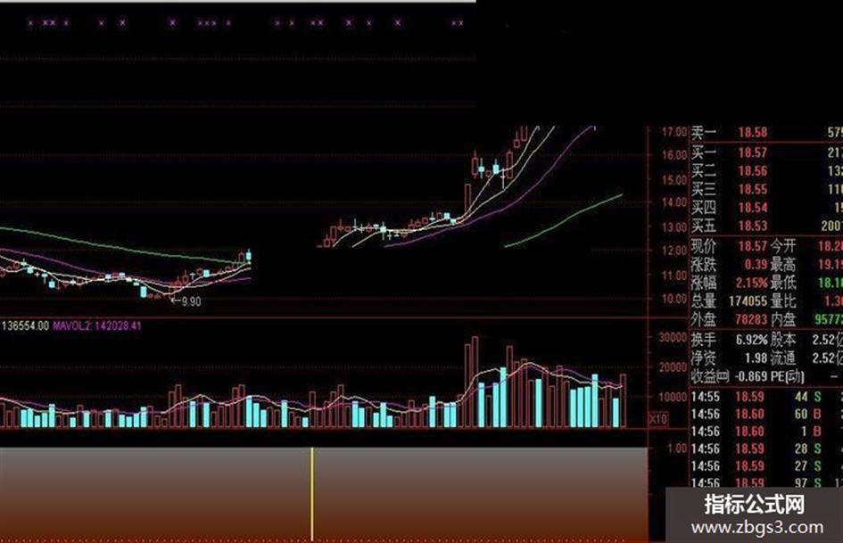 DRAWGBK(CURRBARSCOUNT=1, RGB(110,108,108),RGB(88,30,0),0,'',0); V2:=SMA(IF(C>=REF(C,1),V,-V/100),2,1); XG:CROSS(V2,REF(V2,1)*1.2) AND LONGCROSS(CLOSE,REF(C,1)*1.025,4) AND V/REF(MA(V,5),1)>2,REF(V2,1),STICK,COLORYELLOW,LINETHICK2;