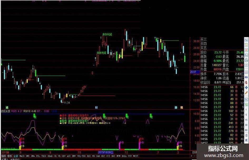 DRAWTEXT(卖出条件 AND D2>=23 AND D2<27,HIGH*1.13,'↙赚25%'),colorred;