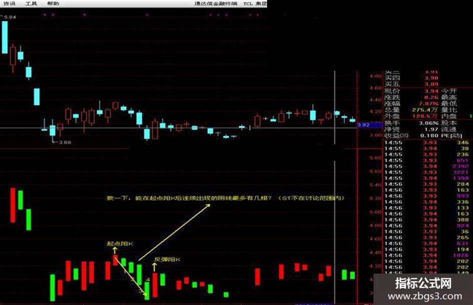 两根绝对阳线之间最多会出现几根绝对阴线?使用下面指标数数看,可能对你的抄底有非常大的预判作用。 规则:起点阳后不能断开出现空档,必须连续出现阴线。ST股我没有列入讨论,想加进可以自行修改源码