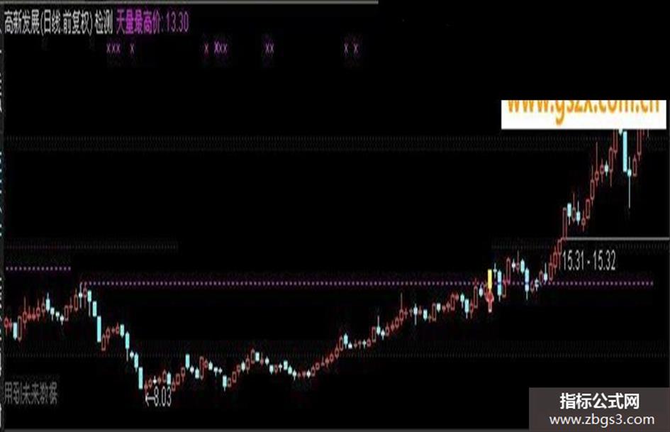 天量最高价:DRAWLINE(HT=0,REF(H,HT),HT1=0,REF(H,HT),1),DOTLINE,COLORMAGENTA;