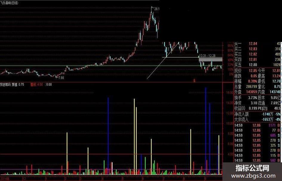 STICKLINE(盈亏筹码<0 AND 穿透>4,0,穿透,1,0),COLORBLUE;