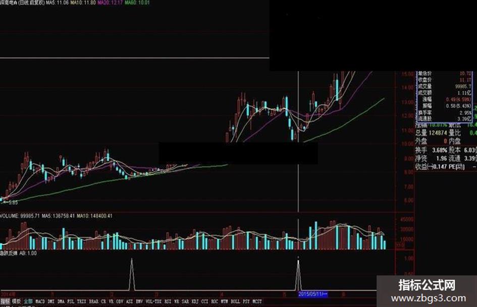 输出 AB:J上穿3.8 AND 11日内最高价的最高值/1日前的收盘价>1.11 AND 1日前的成交量(手)<2日前的成交量(手)