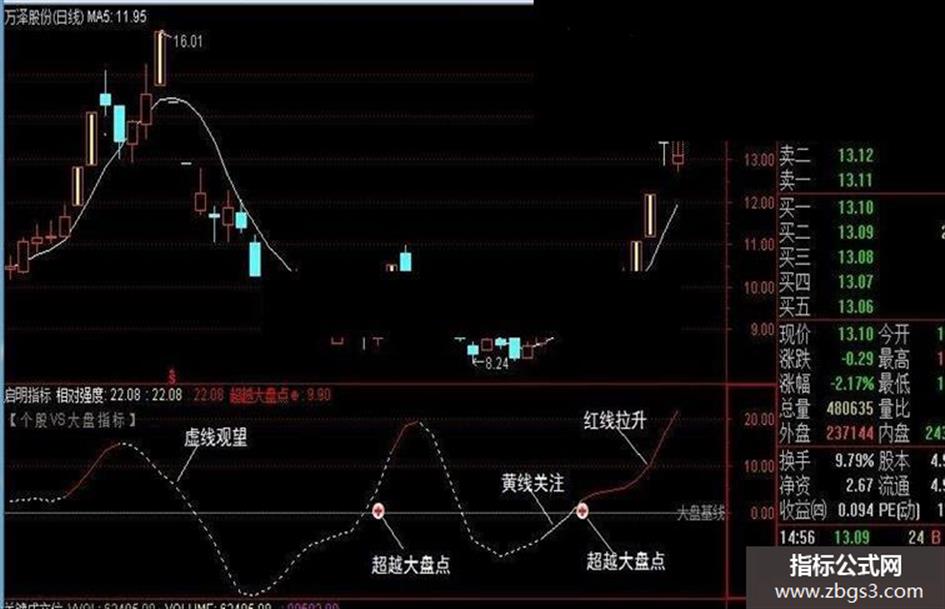 个股图例(如用本指标看大盘,你会发现指标总是超不过大盘基线,因为自己永远无法超越最好的自己哈):