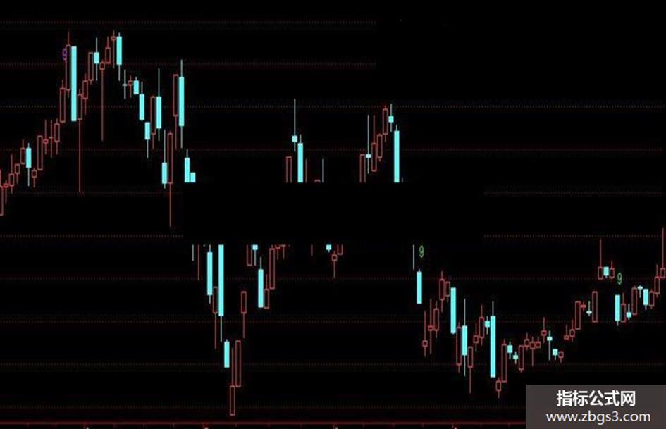 SBZLPA1:=BARSLAST(L=HHV(L,13)); 我心飞扬:=EMA(SBZLPA1,23); XG:=BARSLAST(我心飞扬<REF(我心飞扬,1) AND REF(我心飞扬,1)>REF(我心飞扬,2) AND 我心飞扬>4 )=9; DRAWKLINE(H,O,L,C); DRAWTEXT(XG AND C>=O,H*1.03,'9'),COLORMAGENTA; DRAWTEXT(XG AND C<O,H*1.03,'9'),COLORGREEN;