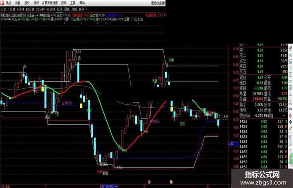 通达信【案内操盘】主图指标多层均线系统 结合动态价格通道划分六大关键区域源码