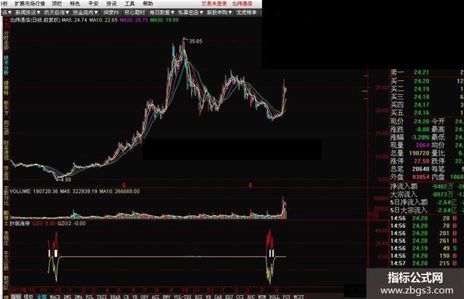 QZG: EMA(IF(LOW<=VARE,(VARD+VARF*2)/2,0),3)/618*VAR10, COLORRED;