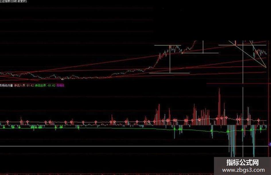 净流入界:C/50,COLORLIRED; 净流出界:-C/50,COLORGREEN; AA:=C-MA(C,9),NODRAW; 市场动力量:(AA)*(V/MA(V,9)),VOLSTICK; DRAWICON(CROSS(市场动力量,净流入界),净流入界,1); DRAWICON(CROSS(净流出界,市场动力量),净流出界,2);