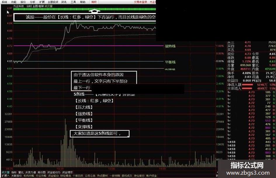 2:四条指标线,一开盘就固定显示,理论上不再变化(使用的日线收盘价,无未来数据),而且四条线的上下顺序是固定的(【压力线】,【强势线】,【平衡线】,【支撑线】,【长线:红多绿空】)