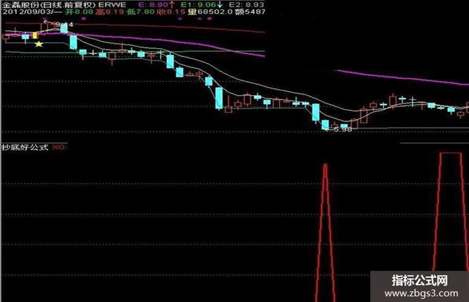 连跌5天:=DOWNNDAY(CLOSE,5); 四串阴:=EVERY(CLOSE<OPEN,4); F1:=IF(C>REF(C,1),100*VOL/CAPITAL,0); F2:=IF(C<REF(C,1),100*VOL/CAPITAL,0); XX:=-SUM(F2,5); YY:=SUM(F1,5); ZZ:=XX+YY; XG:(连跌5天 AND XX=ZZ) OR (四串阴 AND XX=ZZ),COLORRED,LINETHICK2;