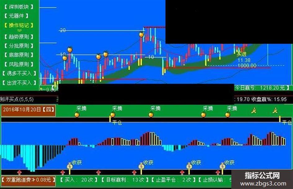 公式说明: 买点公式请自由替代,这里用5日上穿10日均线仅为说明使用,红标记为买点, 收获表示已达心里价位(可自己设定百分点)心平静地人可以逄高发落, 平仓表示满足持有天数想换味(可自己设定天数)不论成败轻松走人, 小人表示亏了(可自己设定止损点)纠错走人, 采摘表示相交巳久走势不再诱人、止息了、闪退!