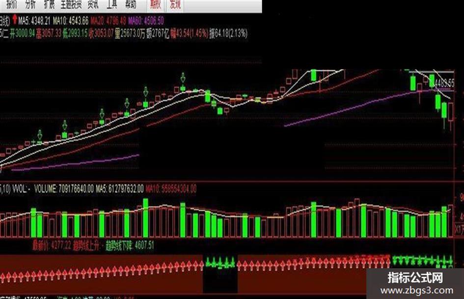 趋势线上升:IF(HS,趋势线,DRAWNULL),LINETHICK2,COLORRED;