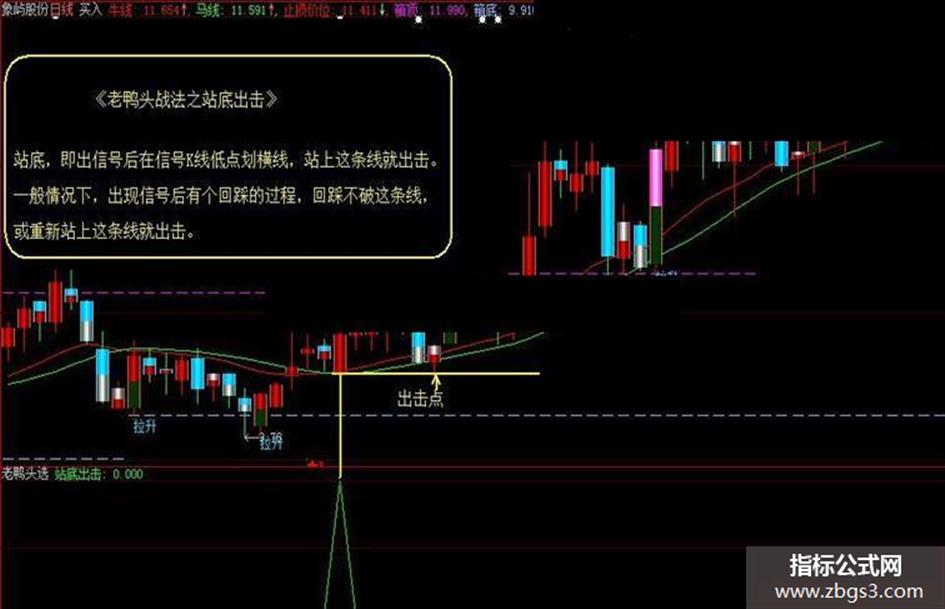 《老鸭头之站底出击》中的站底,是指信号出现后,往往有个回踩过程,在信号K线低点划线,重新站上这条线或不破这条线出击。为选取攻击力强的个股,需要俺的另一个指标配合,请在本论坛寻找。