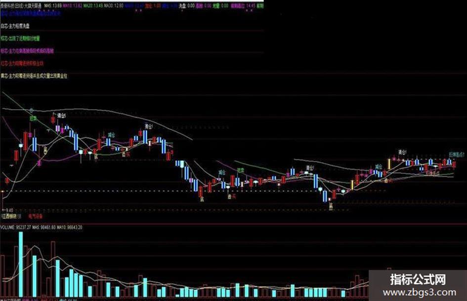 DRAWTEXT_FIX(1,0.00,0.3,0,'黄芯-主力吸筹进货强并且成交量出现黄金柱'),COLORYELLOW,LINETHICK1;