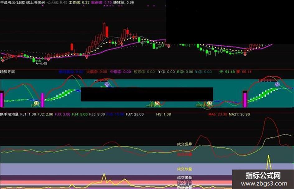 用笔均量和换手率扑捉主力的踪影,上面红线和黄线是笔均量,下面黄线是换手率以及和成交量的关系区间,怎么用对比K线图一看就明白了,