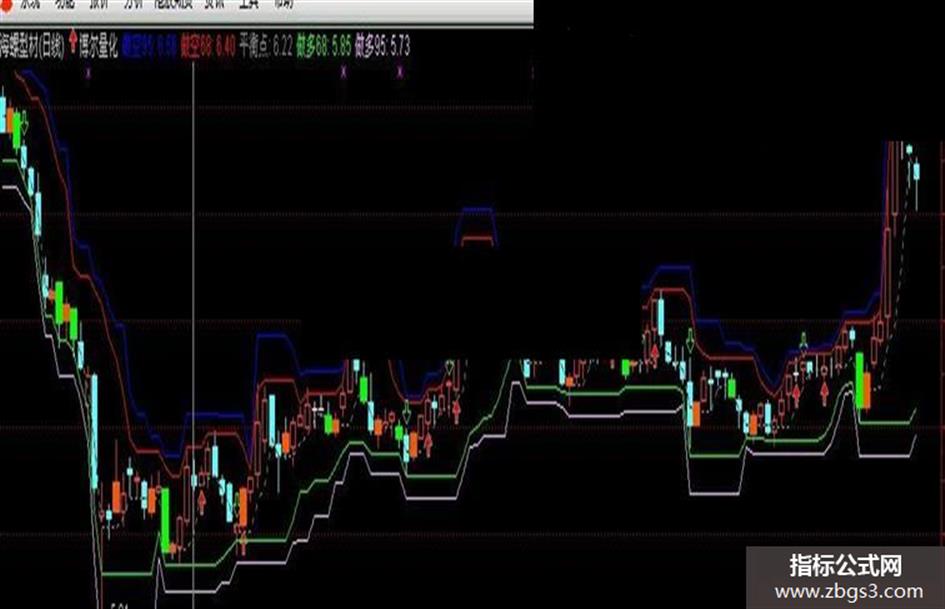 中灰线为做空概率为95%,蓝线为做空概率为68%,紫线和黄线分别为做多概率为68%和95%,本指标从趋势上可以将股市历史运行及未来趋势一览众山小,真正做到知彼知己百战不殆。