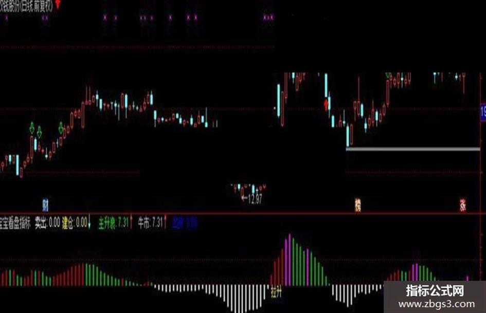 牛市:IF(VAR2>50 AND COST(85)<CLOSE AND VR>0,VR,0),COLORFF00FF,LINETHICK0;