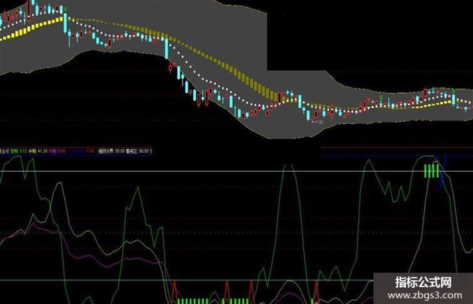 IF(FILTER(中期<REF(中期,1)AND 中期>90 AND BB<REF(BB,1),5),80,100),COLORBLUE,LINETHICK2;