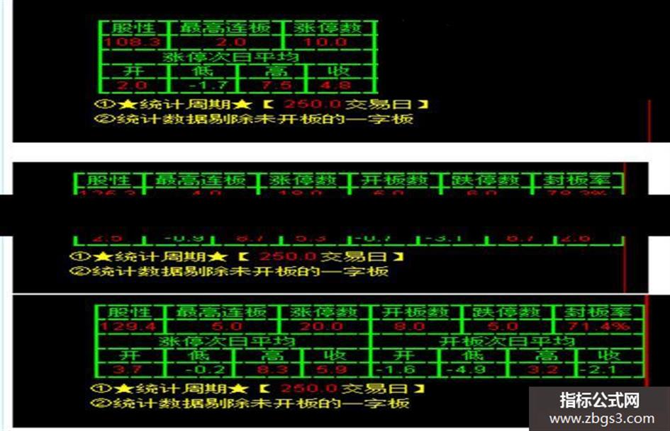 DRAWTEXT_FIX(CLOSE>0,0.79,0.05,0,'┃股性┃最高连板┃涨停数┃开板数┃跌停数┃封板率┃')COLORGREEN;