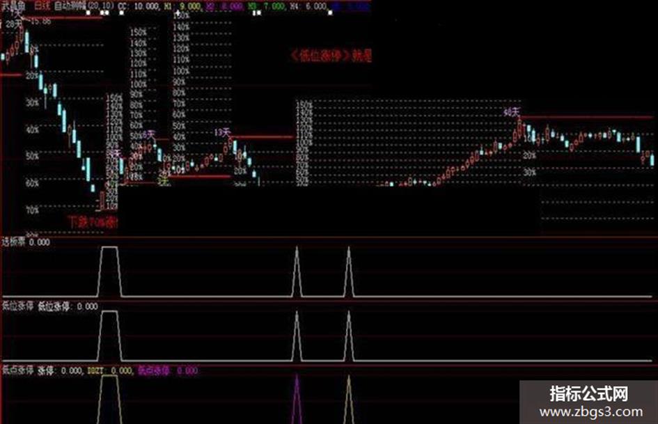 一、思路:低点涨停,首先要确定低点的性质,也就是说什么时候算是低点?这个公式俺把低点限制在20天跌幅超过50%的个股(包含跌幅50%)。一个票在20天的时间内跌幅50%,属于超跌个股,若在这个区间出现涨停,说明机构洗盘到位,基本有一波像样的反弹。如图1,第一次下跌幅度70%一个涨停,第二次下跌50%又一个涨停,这两个低点都有一次不错的反弹机会。