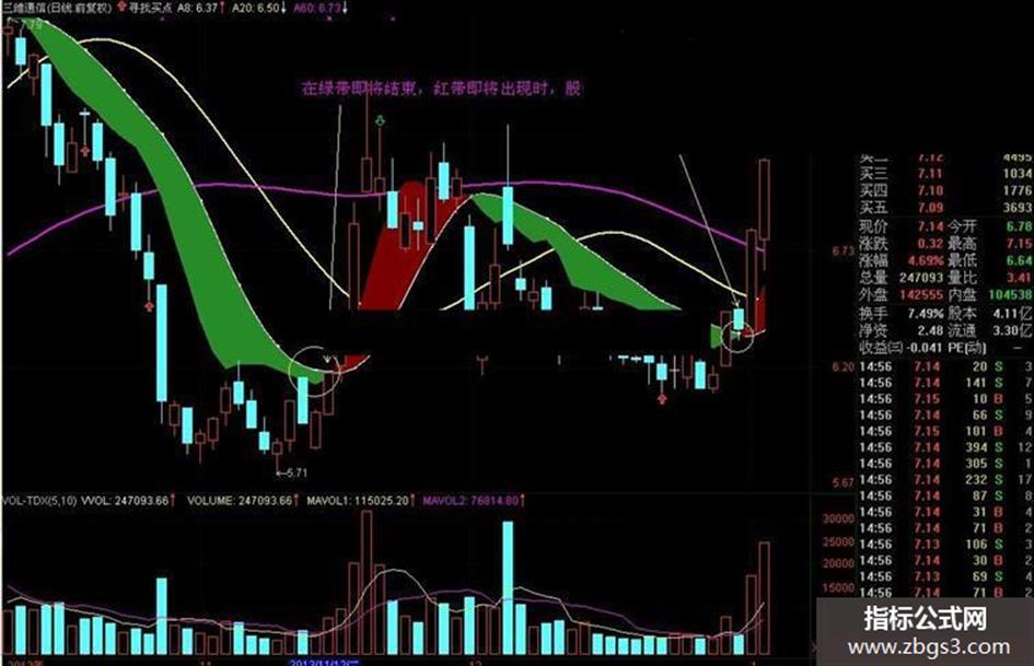 说明:在绿带即将结束,红带即将出现时,股价在A8上方逢低介入。用选股很难表达出来