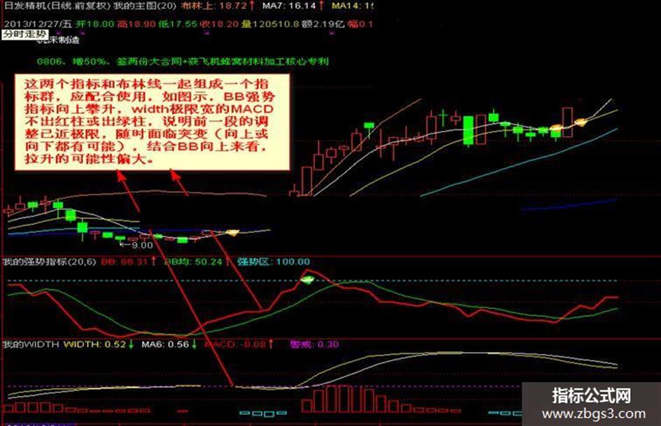 这两个指标和布林线一起组成一个指标群,应配合使用,如图示,BB强势指标向上攀升,width极限宽的MACD不出红柱或出绿柱,说明前一段的调整已近极限,随时面临突变(向上或向下都有可能),结合BB向上来看,拉升的可能性偏大。