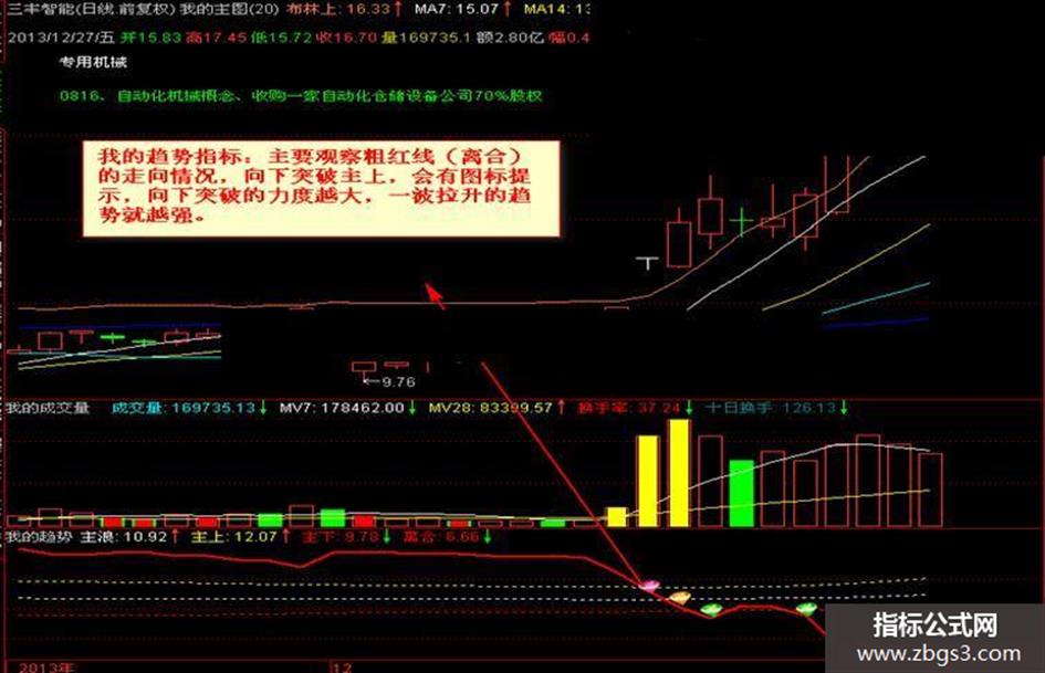 我的趋势指标:主要观察粗红线(离合)的走向情况,向下突破主上,会有图标提示,向下突破的力度越大,一波拉升的趋势就越强