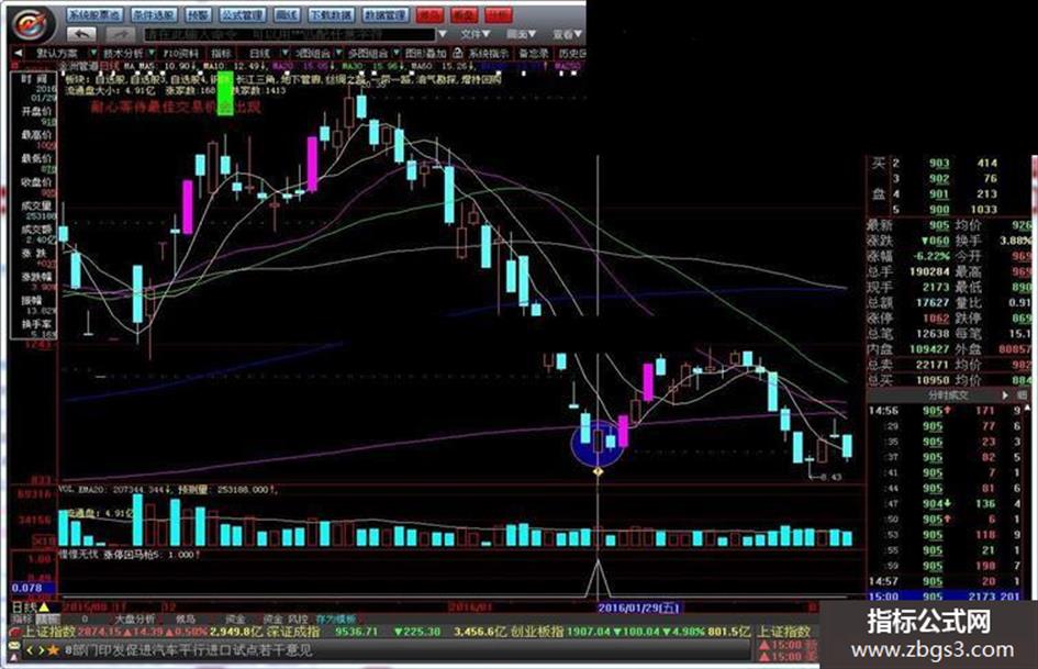 这个指标的思路是专门跟踪一波下跌行情末端,尾盘出现明确见底征兆时,发出买入信号。 指标的成功率非常高:长期、中期、短期的成功率均100%,且无未来函数,尾盘的信号不会漂移,可靠性较好! 本人经过常期跟踪、测试、实盘后,确认指标可以在近期的三波股灾中使用,且收益非常可观