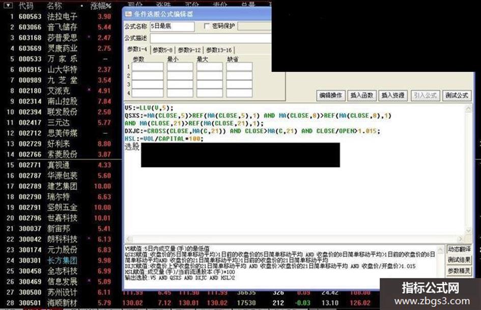 V5:=LLV(V,5); QSXS:=MA(CLOSE,5)>REF(MA(CLOSE,5),1) AND MA(CLOSE,8)>REF(MA(CLOSE,8),1) AND MA(CLOSE,21)>REF(MA(CLOSE,21),1); DXJC:=CROSS(CLOSE,MA(C,21)) AND CLOSE>MA(C,21) AND CLOSE/OPEN>1.015; HSL:=VOL/CAPITAL*100; 选股:V5 AND QSXS AND DXJC AND HSL>2;