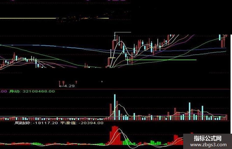 STICKLINE(标振1 AND 量振1 AND 周趋势>平滑值,0,A0,3,0),COLORYELLOW;