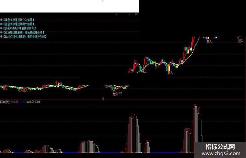 这个指标如果用好了,可以一年翻倍没有问题。 大家在使用时一定要好好的研究一下,找到它的特点,这样使用起来才能得心应手。成为你强大的利器。 具体用法: 1 见红色的柱出现就买,   2 黄色出来就卖。   3 还可以等黄色的柱消失的时候卖。   4 每次赚5%就跑。不要贪。   5 记住以上规则,按规则操作源码A:0,POINTDOT,画洋红色,线宽为3