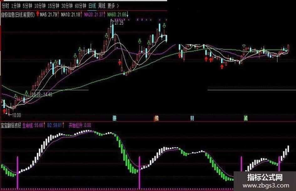 开始拉升:IF(CROSS(VARC,生命线) AND VARC>VARD AND VARC<55 AND C>O,50,0),COLORFF00FF,STICK,LINETHICK4;